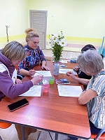 Для родителей юных получателей услуг педагог-художник Лилия Глазова провела занятие по арт-терапии, участники которого погрузились в мир красок и фантазии, создавая картины методом кляксографии.